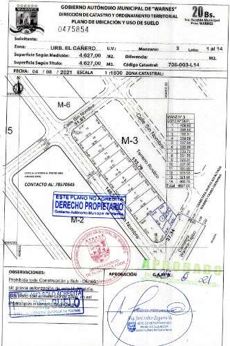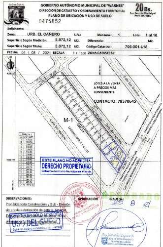 Te ofertamos lotes de terrenos, en urbanización "El Cañero", totalmente consolidado, vivientes en la zona, organizados en junta vecinal, OTB, energía eléctrica, agua potable, transporte, papeles al día, trato directo con el propietario con opción a regatear precios expuestos, céntrico a sólo 3 minutos de la plaza de Warnes, sobre carretera nueva completamente asfaltada Warnes-Tajibo-Okinawa. Para mayor información, contactarse con el número de WhatsApp 78570645.